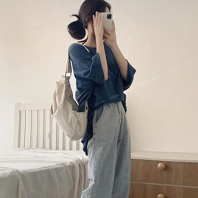 Tシャツ 夏 韓国ファッション Tシャツ半袖 ゆったり 純色ミディアム丈 トップス Tシャツカットソー