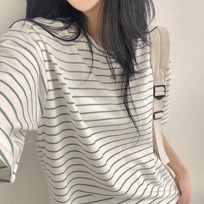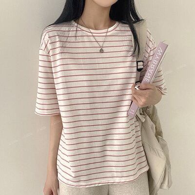 Tシャツ ボーダー半袖Tシャツ 韓国ファッション 女 夏 学生 ゆったりトップス Tシャツカットソー