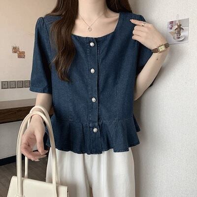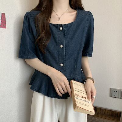今っぽシアーシャツ デザイン感半袖デニムシャツ夏の新作レトロなスクエアネックトップス シースルートップス