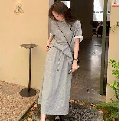 涼しく楽ちんセットアップ 夏のレジャー2点セット純色半袖Tシャツミディアムスリム半身スカートセット