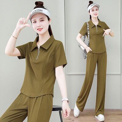 涼しく楽ちんセットアップ 半袖Tシャツワイドパンツロングパンツ2点セット夏の新作カジュアルスポーツスーツ