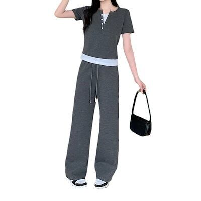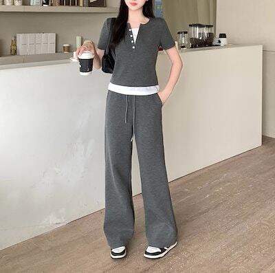 涼しく楽ちんセットアップ オーバーサイズ継ぎ手半袖ワイドパンツスーツ夏服新型通勤カジュアル2点セット