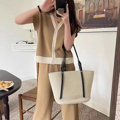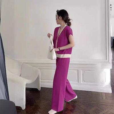 涼しく楽ちんセットアップ 夏 新作Vネックノースリーブニットトップスワイドパンツデザイン感ニット2点セット
