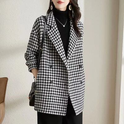 ウンテンパーカー ラシャ シンプル セミロング ホーンバックル 秋冬 千鳥格子 流行り コート 気質 OL通勤 トップス スーツ襟 レディース ジャケット