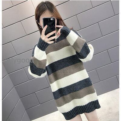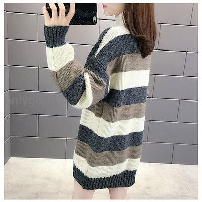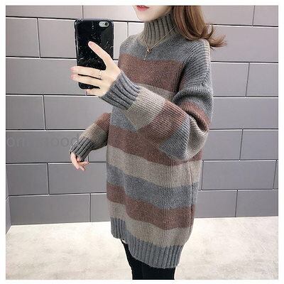 チュニック セーター トップス プルオーバー レディース ロング丈 ニット 長袖 プチハイネック カジュアル ボーダー柄 無地 着痩せ シンプル ゆったり 秋冬