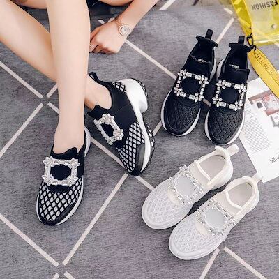?売促? スニーカーシューズ メッシュ スポーツシューズ レディース 厚底 スクエア ビジュー モチーフ 黒