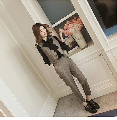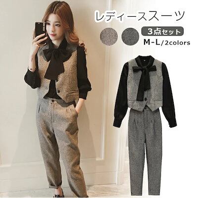 スーツ レディース セットアップ パンツスーツ 3点セット フォーマルスーツ OL レディーススーツ 【ベスト+シャツ+パンツ 】 ママスーツ リボン セレモニースーツ フォーマル 卒業式 入園式 無