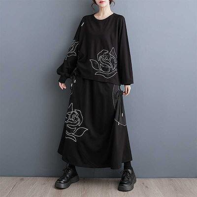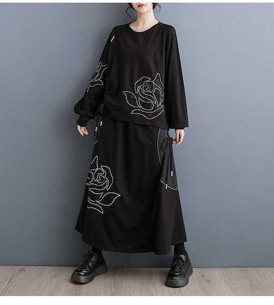 「ファットガール」 2023秋冬 花柄 刺繍 ゆったり 上下セット おしゃれ レディース セットアップ 巾着 スウェット+スカート メガ割
