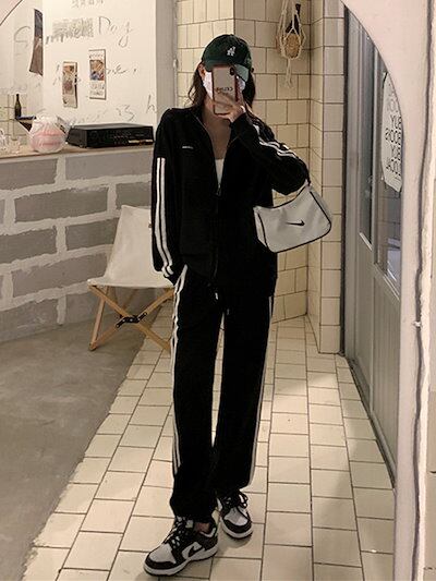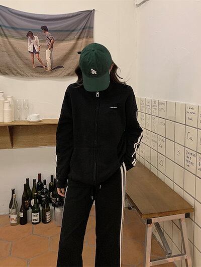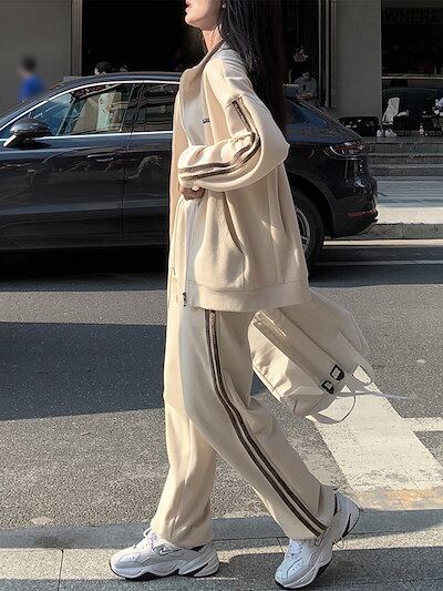 2024 秋冬 2点セット トップス お出かけ 羽織り ショート丈 セットアップフルパーカーラウンドヘムルーズ サイド上下ボトムス ストレート系冬 ゆったりサイズワイドシルエットリラックストラック