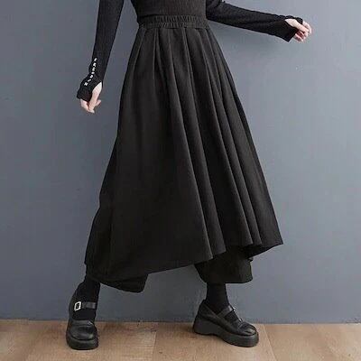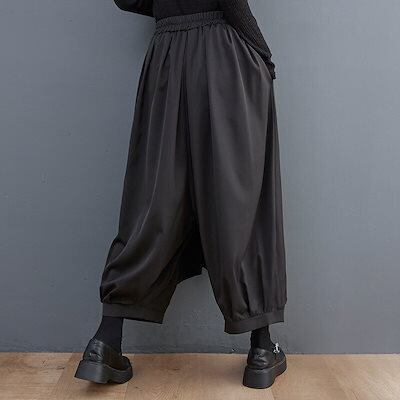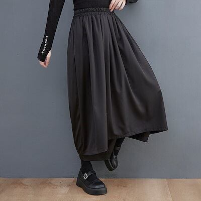 山本ダークワイドパンツ春と秋のゆったりとした大きめサイズのストレートのオールマイティーなカジュアルパンツ黒スカートに厚手のキュロットパンツ