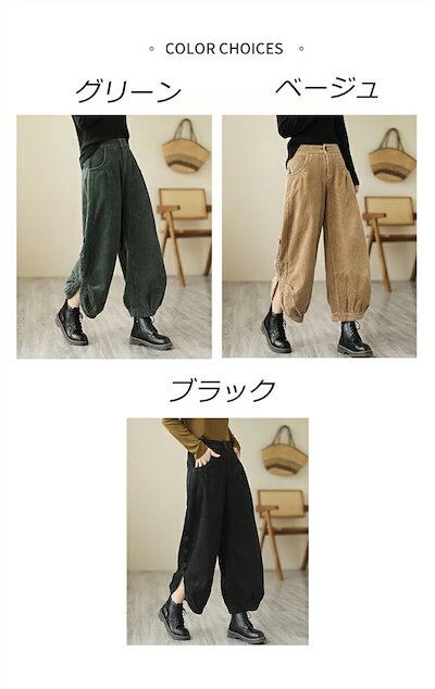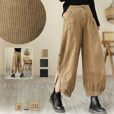 コーデュロイパンツハイウエストワイドボトムスレディース秋冬ウエストゴムコクーンワイドパンツロングコクーンパンツポケット付き脚ゆったりかわいい9分丈大きいサイズ森ガール大人黒ベージュグリーンカジュアル
