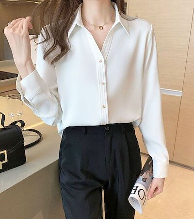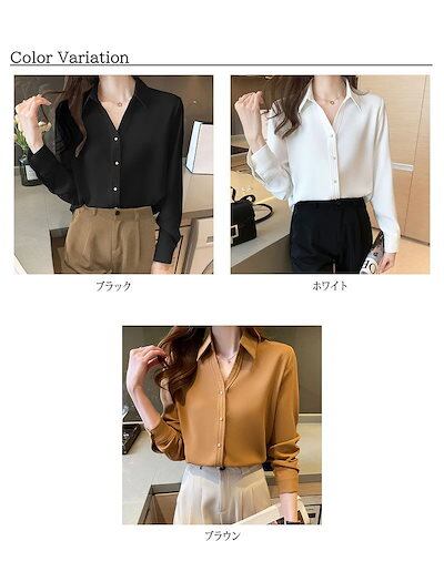 ゴールドボタンサテンシフォンブラウスシャツトップス長袖レディースおしゃれ流行可愛いカジュアル大人可愛いゆったり無地ブラック黒ホワイト白ブラウン
