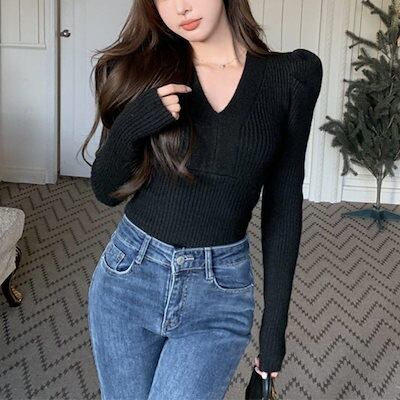 ベーシックニット 韓国版秋冬新作優しくて甘いVネックスリムスリムスリムスリムでモチモチした純欲風ニットバブル袖セーター女