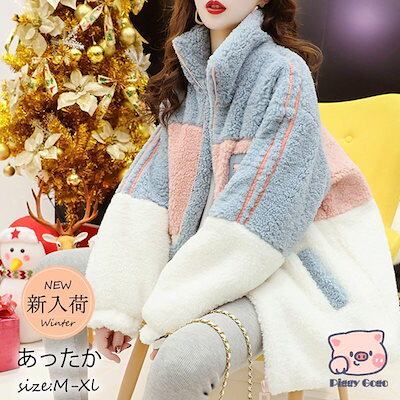 フリースジャケット レディース ボアジャケット ブルゾン アウター もこもこ ゆったり 立ち襟 厚手 配色 暖か 防寒 防風 冬 通勤 学生 おしゃれ