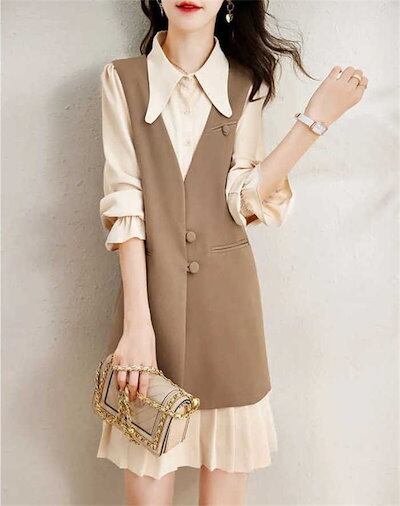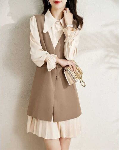 セットアップ ワンピース ベスト レディース 長袖 2点セット トップス ロング プルオーバー 無地 秋 春 秋服 Aライン aライン 通勤 OL オフィス ビジネス エレガント フォーマル 大人 お