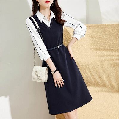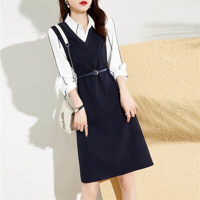 ブラウス+ベストワンピース ワンピース セットアップ レディース 長袖 ワンピース ストライプ 2点セット ベスト ジレ ベルト付き ネイビー ブラウス フォーマル 膝丈 セレモニー 入学式 20代
