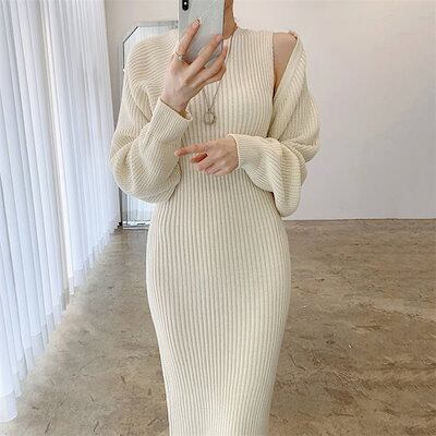 ワンピース セットアップ レディース ワンピーススーツ ドレス 長袖 キャミソールワンピース ワンピース 2点セット フォーマル 伸縮性 セレモニー ニット 膝丈ワンピース ニットワンピース カジュア
