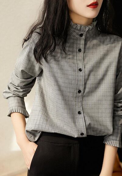 シャツ レディース 長袖 チェック柄 シャツ ブラウス フリル付き スタンドカラー トップス バンドカラー フォーマル ビジネス スーツ インナー ママ 大きいサイズ ゆったり カジュアル 柔らか お