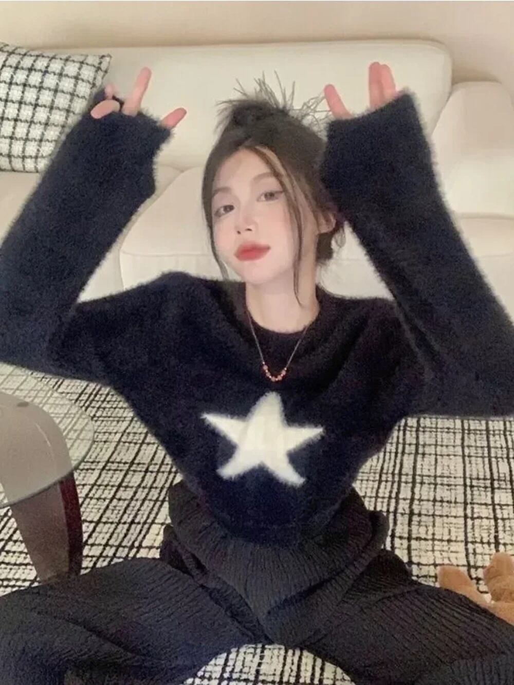 レディース原宿スタークロップドセーター,特大ヴィンテージダンガリー,韓国カジュアルシックプルオーバー,y2k服,2000s, 2023 パーカー ジャージ y2k T240908141605_01