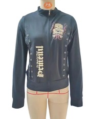 女性のスカルとレタリングプリントのパーカー、サイドタイアップ、長袖、ジップアップ、ブラック、ベーシック、スリムスウェットシャツ、カジュアル、y2k、ファッション パーカー ジャージ y2k T240908164341_01