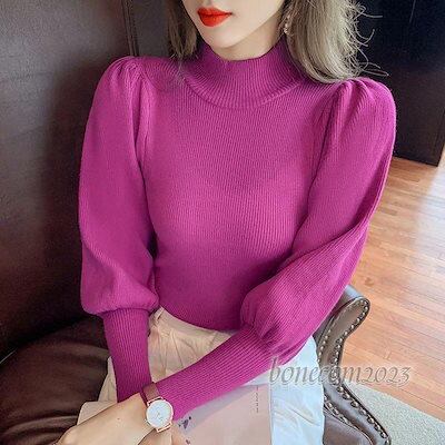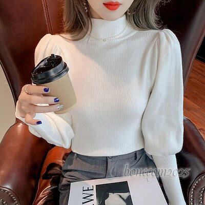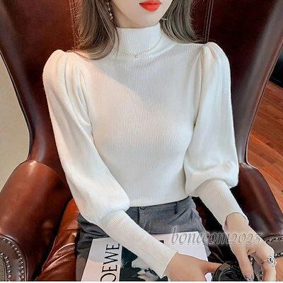 レディース 伸縮性 セーター 長袖 スリム 秋冬 トップス ハイネック ファッション ニット プルオーバー リブニット 春 パフスリーブ 新作 バルーンスリーブ 大人