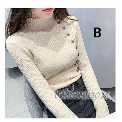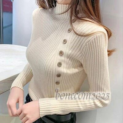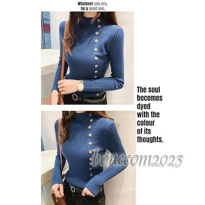 きれい目 トップス ハイネック おしゃれ 春ファッション 大人 スリム 薄手 斜めボタン プルオーバー 秋冬服 細身 レディース 新作 ニットセーター 伸縮性 長袖