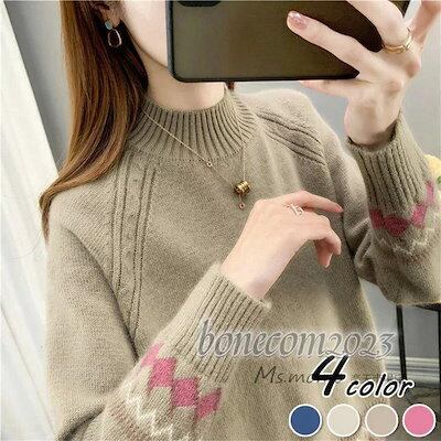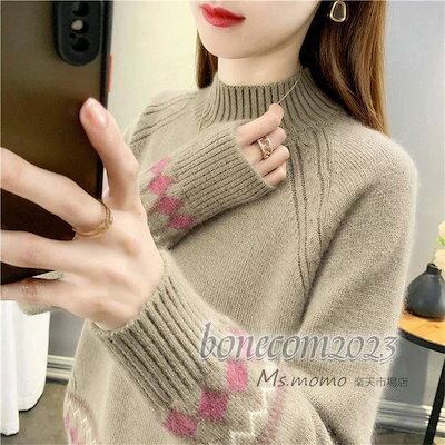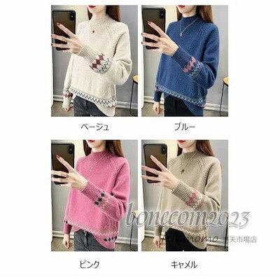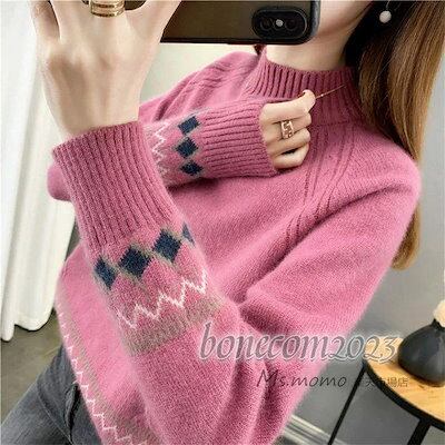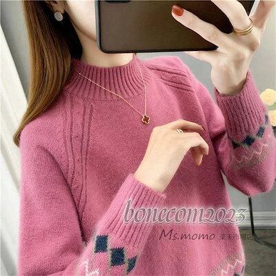 秋冬代長袖セーター ニットトップス レディース ショット丈 オシャレ セーター ひし形 ゆったりプルオーバー 民族風 大人ニットインナー