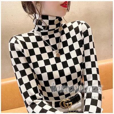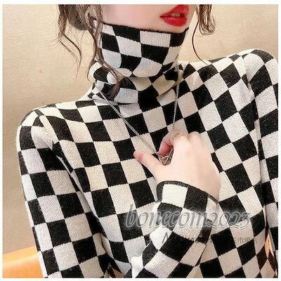 ショット丈セーター ゆったりプルオーバー 大人ニットインナー オシャレ韓国風 ハイネック チェック柄 レディース 秋冬代長袖セーター ニットトップス