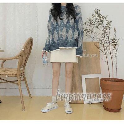 丸首 韓国風 ゆったり トップス セーター セーター代/代 ニットセーター 学生ニット 長袖 チェック柄セーター ニットソー レディース秋冬