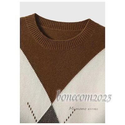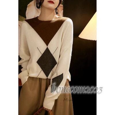 ショット丈セーター 配色 秋冬代長袖セーター 大人ニットインナー レディース ゆったりプルオーバー ニットトップス ひし形 オシャレ韓国風