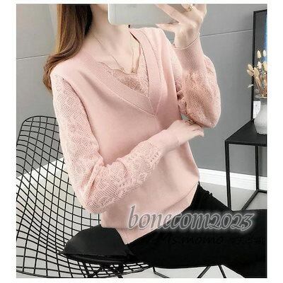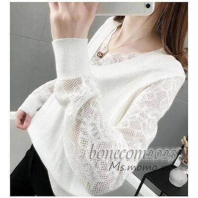 秋冬代長袖 薄手 セーター無地 透かし雕り ゆったりニットインナー ニットトップス 大人 レースネック ショット丈ニットソー レディース ニットトップス