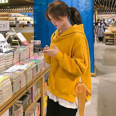 レディース パーカー プルオーバー フード付き スリット オーバーサイズ ゆったり 大きめ トレーナー 長袖 トップス カジュアル 可愛い りぼん おしゃれ レッド ブラック イエロー ブルー