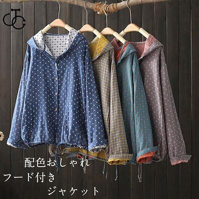 パーカー フード付き 秋 配色 レディース 羽織 トップス 羽織り 長袖 総柄 綿 コットン シャツパーカー 軽い 薄手 ライトコート ジャケット アウター30%までに制限
