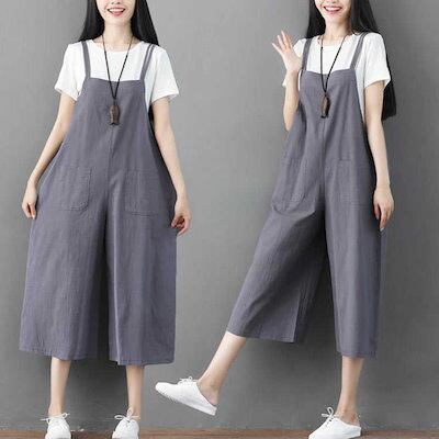 サロペット リネン レディース サロペットワイドパンツ パンツ 薄手 オーバーオール 夏 ゆったりボトムス オールインワン 大きいサイズ 大きサイズ 九分丈 ハイウエスト ゆったり 無地