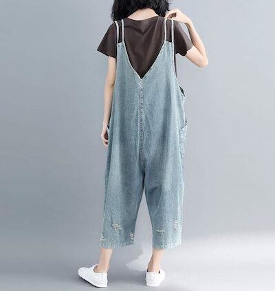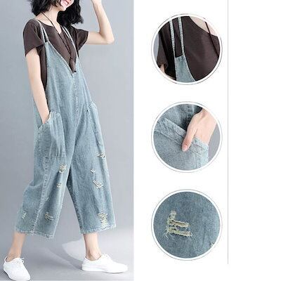 サロペット オールインワン ボトムス レディース ワイドパンツ サロペットパンツ デニムパンツ デニム パンツ ズボン 夏 ロング丈 Vネック オーバーオール デニムサロペット 大人 リラックス 体型