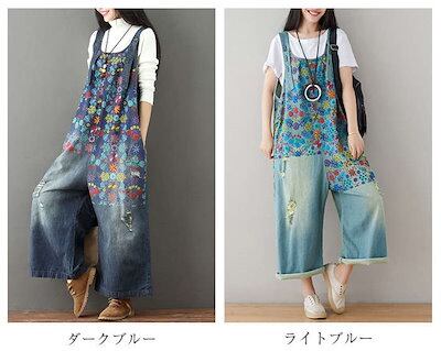 オールインワン デニム サロペット レディース オーバーオール ワイドパンツ デニムパンツ ダメージデニム おしゃれ 可愛い 花柄 プリント エスニック ボトムス パンツ 体型カバー オールシーズン