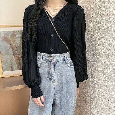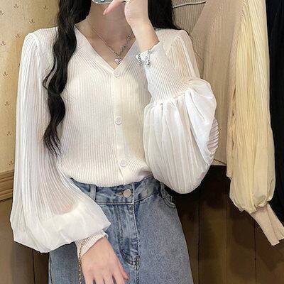 シフォンブラウス紫外線対策シアーシャツカシミヤタッチストライプシャツベーシックニット夏でもブラウスメリヤスシフォンランタン袖長袖アンダーウェア体型カバーチュニック