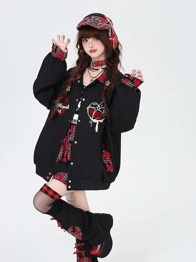 秋冬 ジャケット サブカルプリントプレイドスプライスベースボールジャケットブラウストップルーズ レディースジャケット