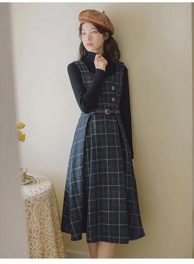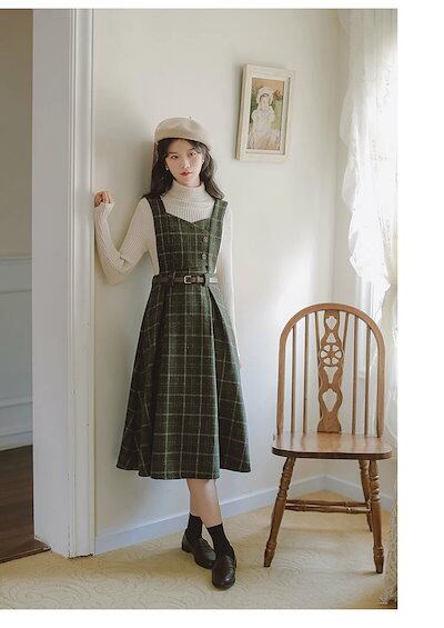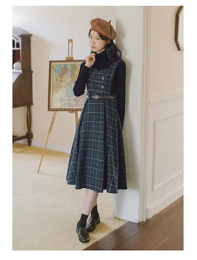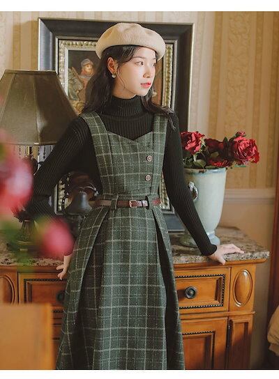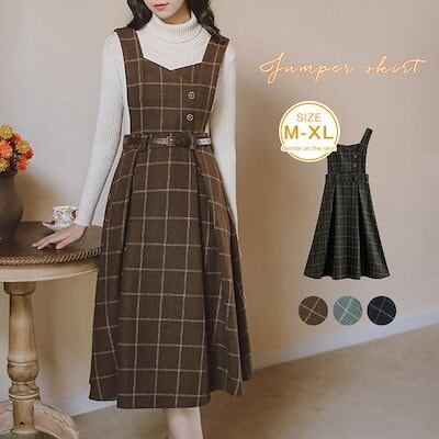 ジャンパースカート チェック サロペットスカート タンクワンピース レディース ジャンスカ ワンピース ミモレ丈 スカート オールインワン キャミワンピ ロンパース 重ね着 可愛い 厚手 春 秋 冬