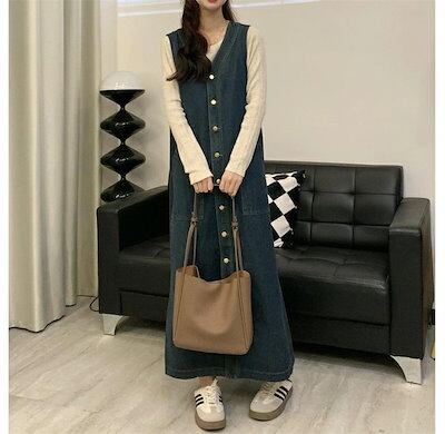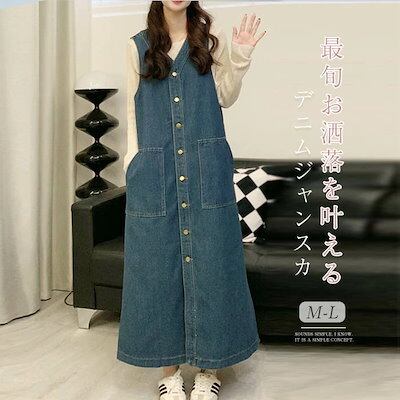 デニムジャンパースカート 秋 デニムワンピース レディース 春秋 冬 デニムサロペットスカート 大きいサイズ ロングワンピース ミモレ丈 ゆったり Vネック Aライン 体型カバー 大人女子 カジュアル