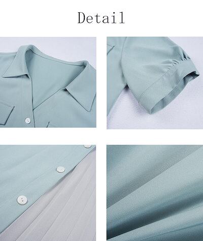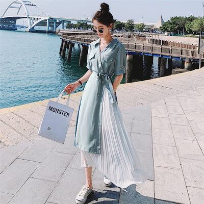 シャツワンピース レディース 春 夏 プリーツワンピース 半袖 シフォン ドッキング プリーツ 折り襟 ワンピース Aライン フレア リボン ロングワンピース ゆったり 体型カバー きれいめ ミモレ丈