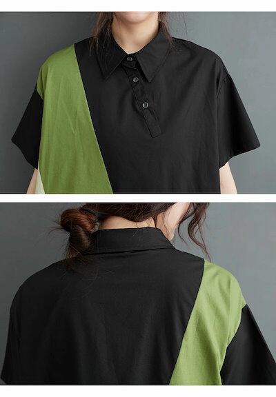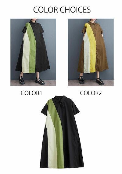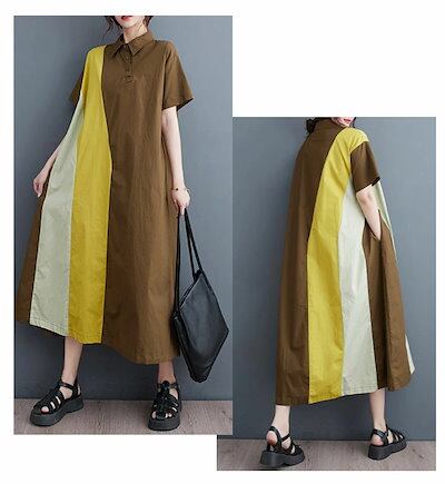 シャツワンピース 切り替え レディース ロングワンピース 半袖 ドッキング 折り襟 半袖ワンピース Aライン フレア ポケット付き ワンピース ゆったり 体型カバー きれいめ ミモレ丈 夏ワンピ 切り