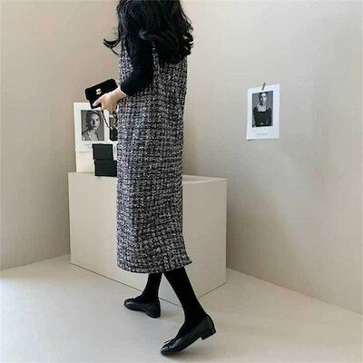 ジャンパースカート レディース 秋冬 オールインワン Vネック ノースリーブ ロングワンピース ツイード 総柄 ワンピース ロング丈 重ね着 サロペット スカート レイヤード Aライン ジャンスカ 大