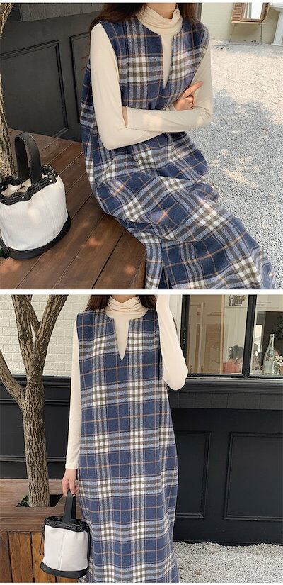 ジャンパースカート ロング丈 秋 冬 ノースリーブ Vネック チェック柄 ワンピース ロング カジュアル ロングワンピース フォーマル オフィス 通学 通勤 レディースファッション 20代 30代 4