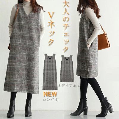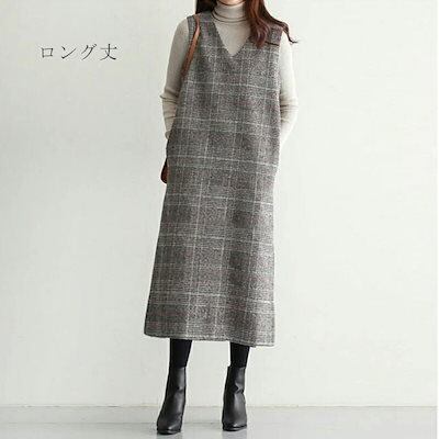 ジャンパースカート 秋冬 ロング ワンピース 秋 チェック レディース Vネック ジャンパースカート ジャンスカ オールインワン ワンピ ノースリーブ タンクワンピース 重ね着 大人 フォーマル OL