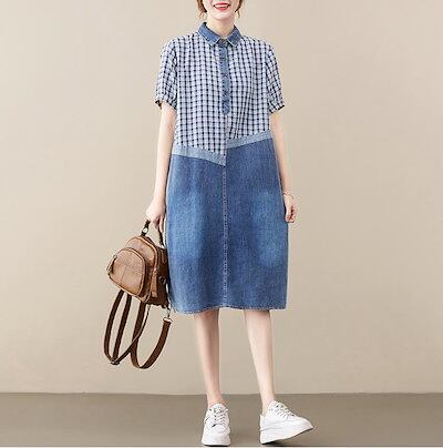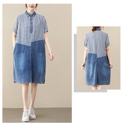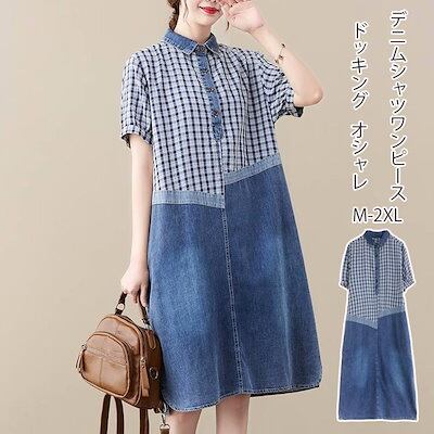 デニムワンピース レディース シャツワンピース デニム ドッキング ワンピース 夏 春 チェック 半袖 折り襟 ボタン チュニック 切り替え 膝丈ワンピース Aライン フレア ゆったり チェックワンピ