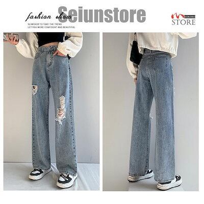 バギーパンツ ワイドパンツ ジーンズ ロング丈 デニムパンツ レディース ダメージ加工 ウォッシュ ク 春夏