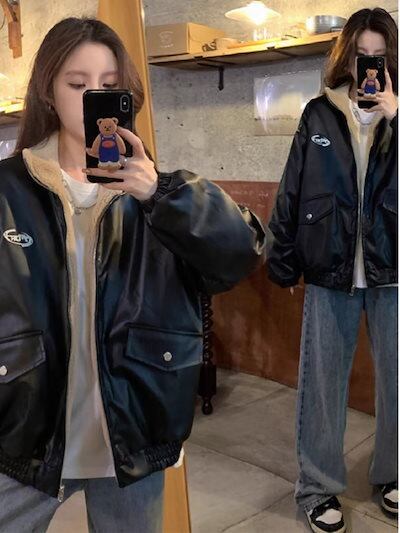 秋冬防寒 あったか 中綿 レザーアウター 韓国風スタイルアップ かわいい ブルゾンファー付きファッション系裹起毛大人ゆったりカジュアルストリートサイズレディースムートン襟フリースシルエット学生通学丈