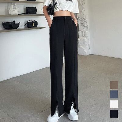 パンツ レディース 春夏秋 ロング丈 ストレート スリット センタープレス ウエストボタン ポケット スラックス ポリエステル 大人 黒