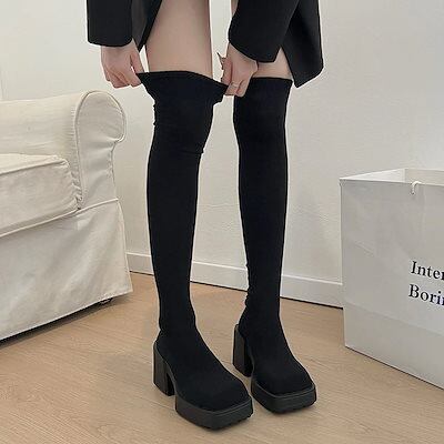 【2枚購入で 2oo円OFF!】ショートブーツ スクエアヘッド ニーハイ チャンキーヒール ロングブーツ レディース 秋 厚底 ニット ストレッチ 靴下ブーツ 韓国ファッション